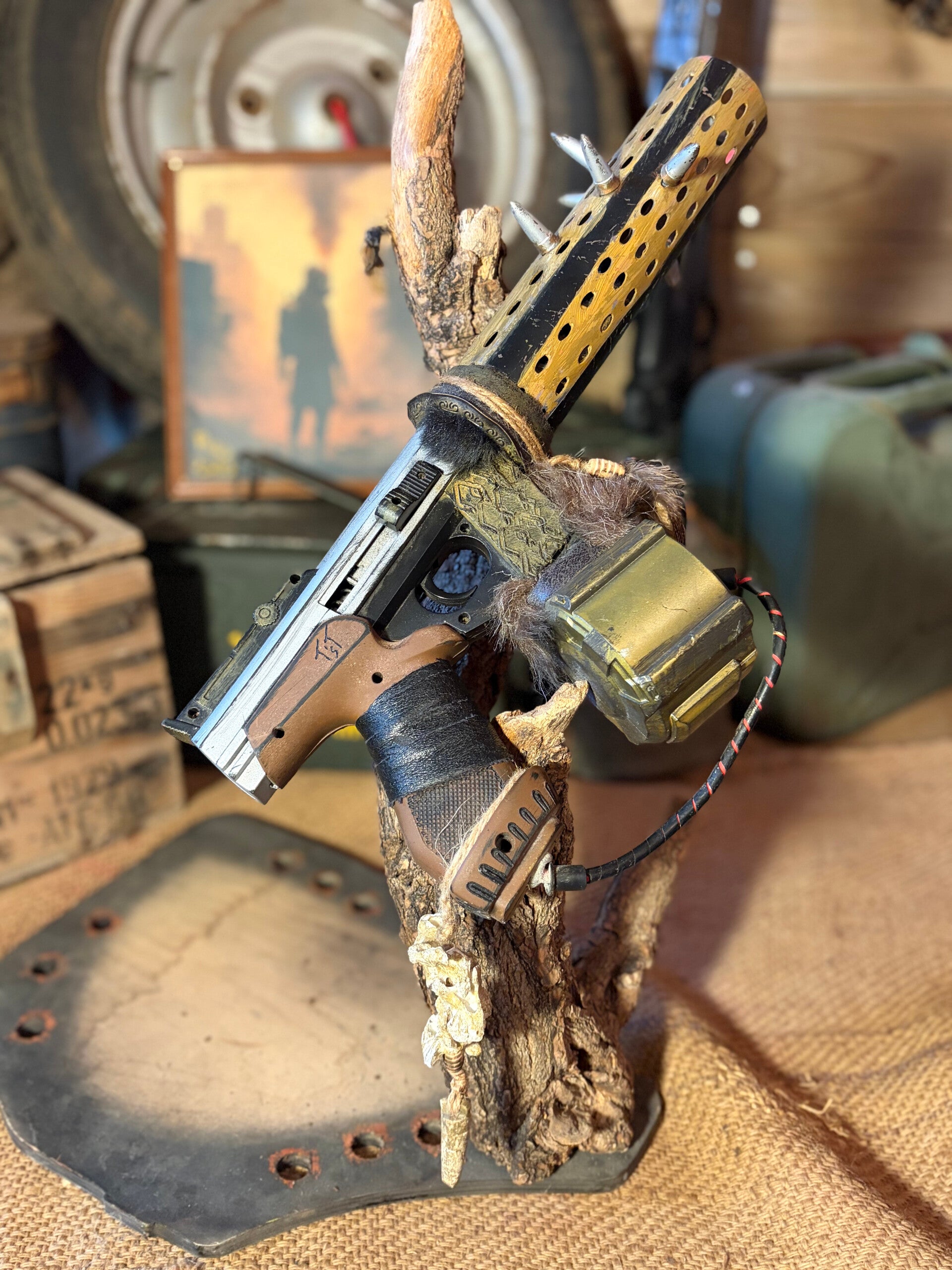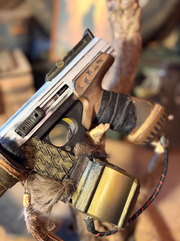 Cette réplique est celle d'un pistolet automatique avec chargeur grande capacité et canon avec piques, ce qui pourrait lui procurer une possible utilisation en seconde main ! Sa custom est inspirée de la licence Mad Max et Borderland, une arme destinée aux chasseurs de primes ou aux rebelles du désert ! À vous de choisir...